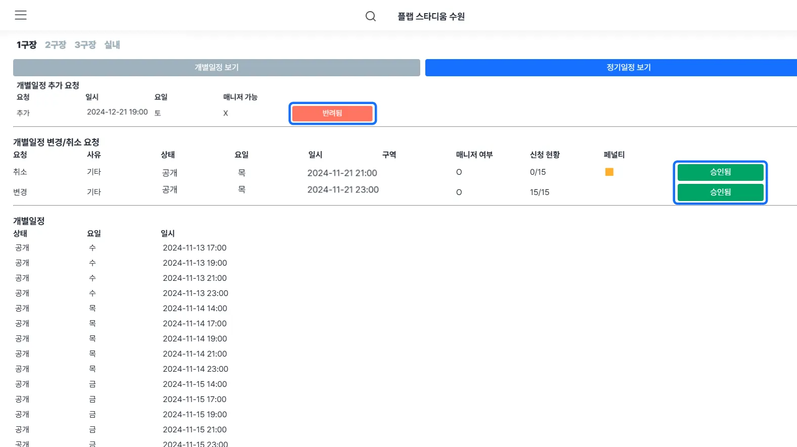 요청하신 내용에 대한 검토 결과는 구장관리사이트 [소셜 매치 추가/변경/취소] 페이지에서 직접 확인하실 수 있어요.