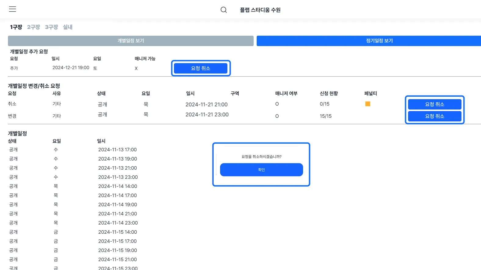 이 외 기간에 정기 일정 추가·취소를 요청주시는 경우, 위 문구가 나타나요.