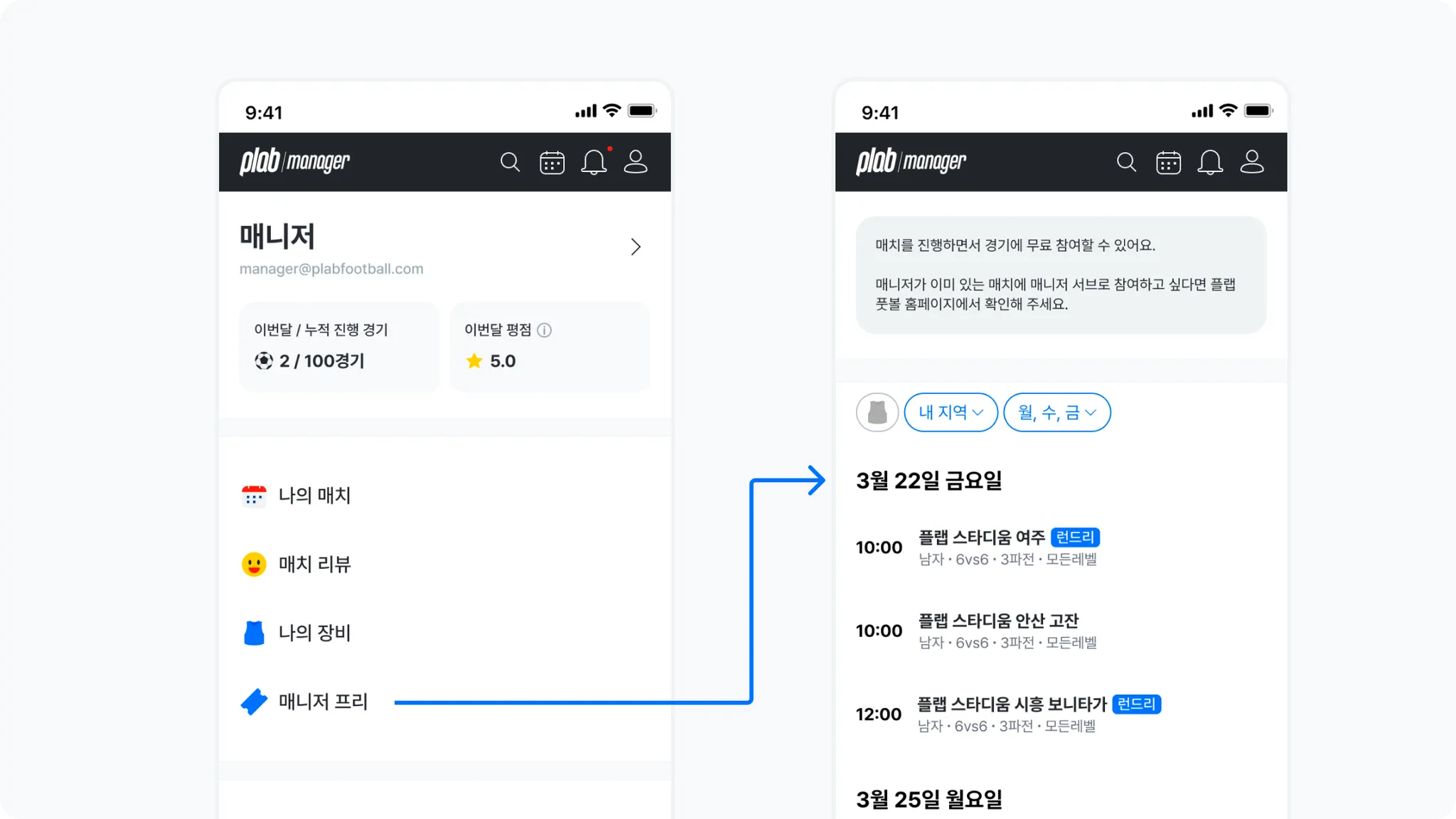 매니저 서브는 당일 인원에 따라 자동으로 운영됩니다. 매치 선택 시 ‘매니저 프리’ 매치를 선택하지 않았다면 당일 매치에 서브가 오픈되어 있는 경우에만 신청 가능해요.