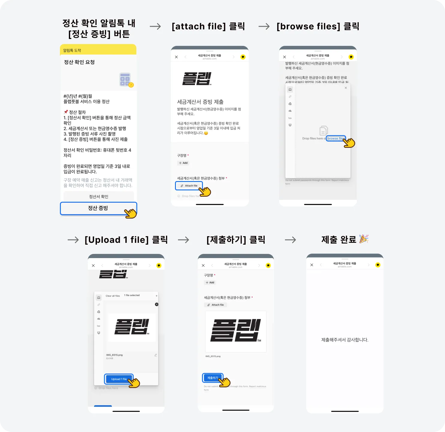 매월 5일 발송되는 정산 알림톡 내 버튼 [정산 증빙]을 통해 세금계산서(혹은 현금영수증)를 제출해 주시면,