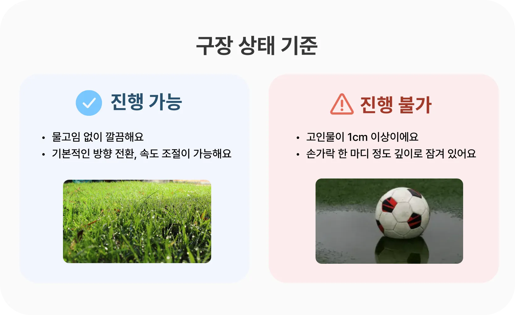 비 오는 날에도 플래버가 안심하고 매치에 참여할 수 있도록 아래 기준에 따라 구장을 준비해 주세요!