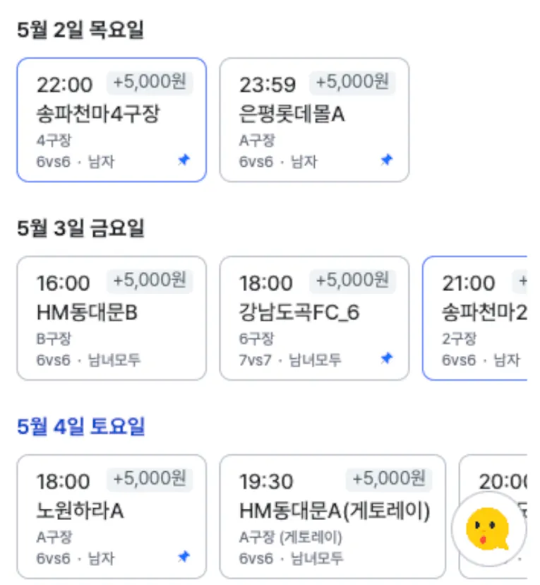 당일 인원 모집이 필요한 매치인 경우 자동으로 오픈되며, 무료 신청이 가능해요.