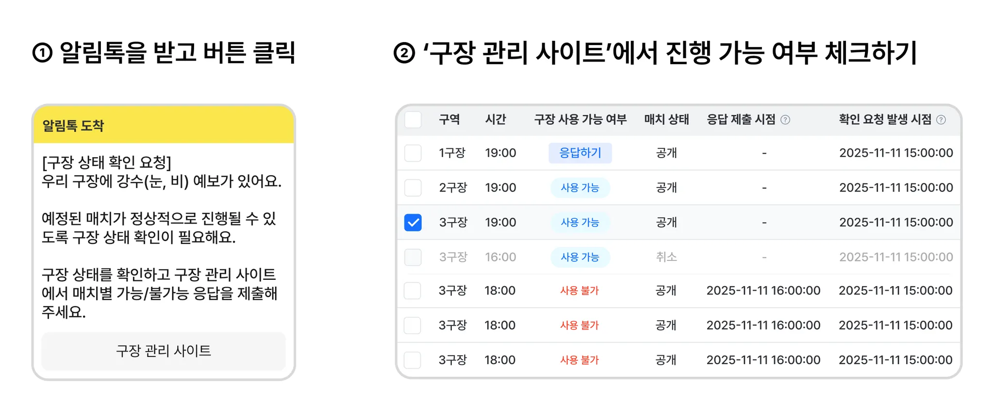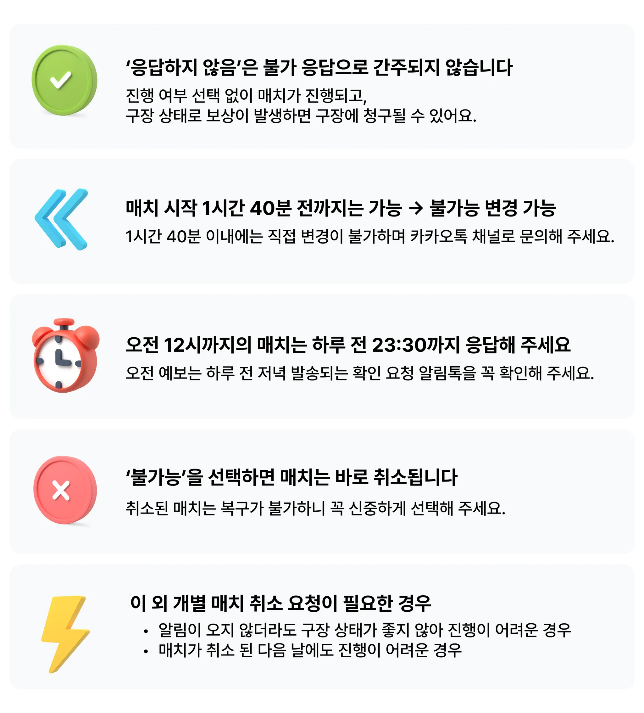 전날 발송된 “구장 상태 확인 요청” 알림에 해당되는 오전 10시 매치까지는 전일 23:30까지 진행 여부를 선택해야 해요.