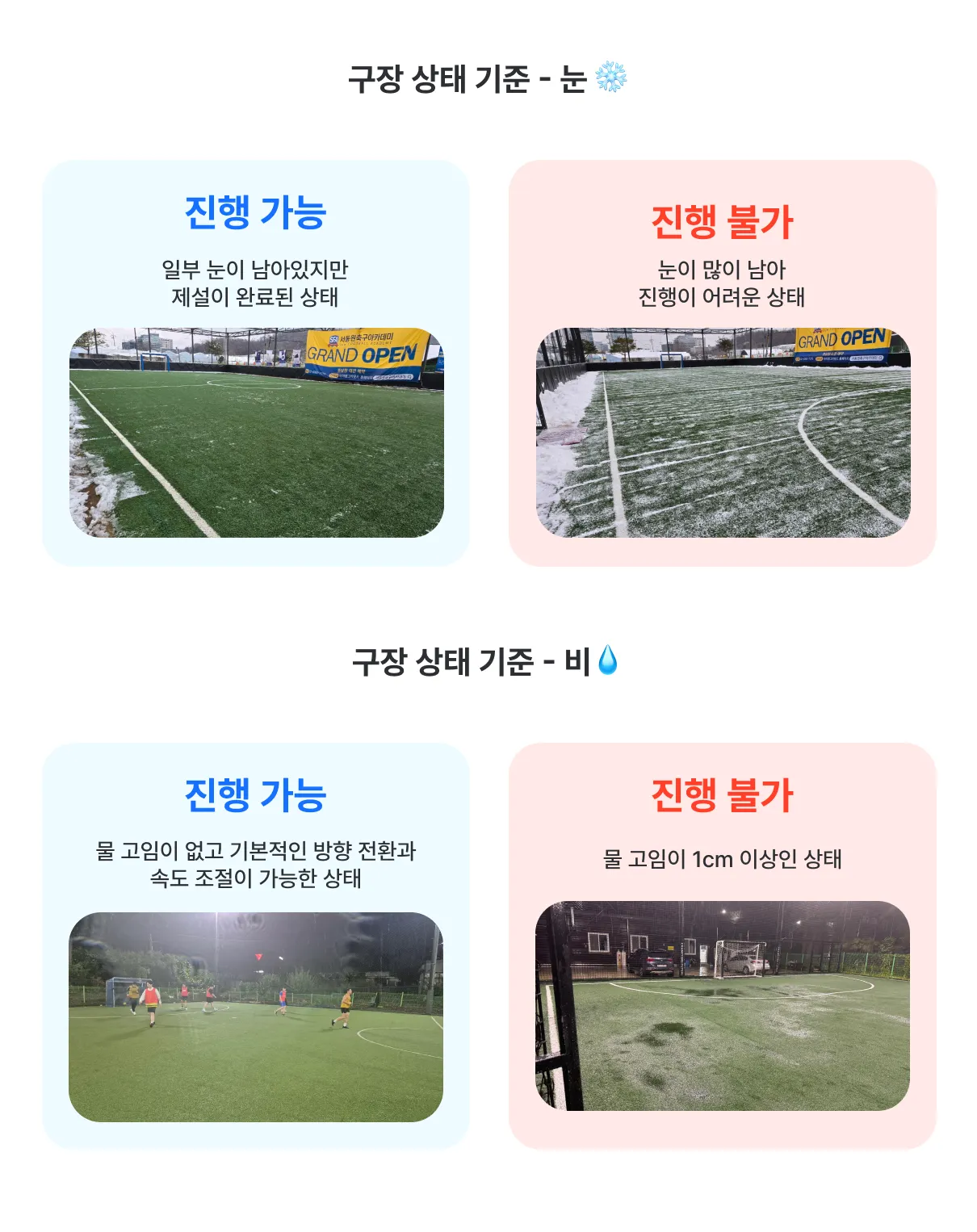 다소 배수/제설이 미흡하거나 운동하기 어려운 환경이라면 조금 더 확실한 배수/제설 혹은 매치 사전 취소를 권장드려요. 추가적으로 현장에서 취소가 발생하는 경우 이후에는 예보 발생 시 가능 체크 여부와 관계없이 매치가 사전 취소 될 수 있어요. 구장을 이용하지 못해 발생한 추가 보상이 구장 정산에 반영돼요.