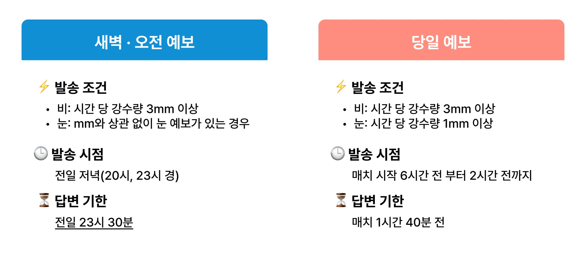 예) 오후 2시 비·눈 예보가 있다면, 오후 2시 이후 모든 매치가 리스트에 표시