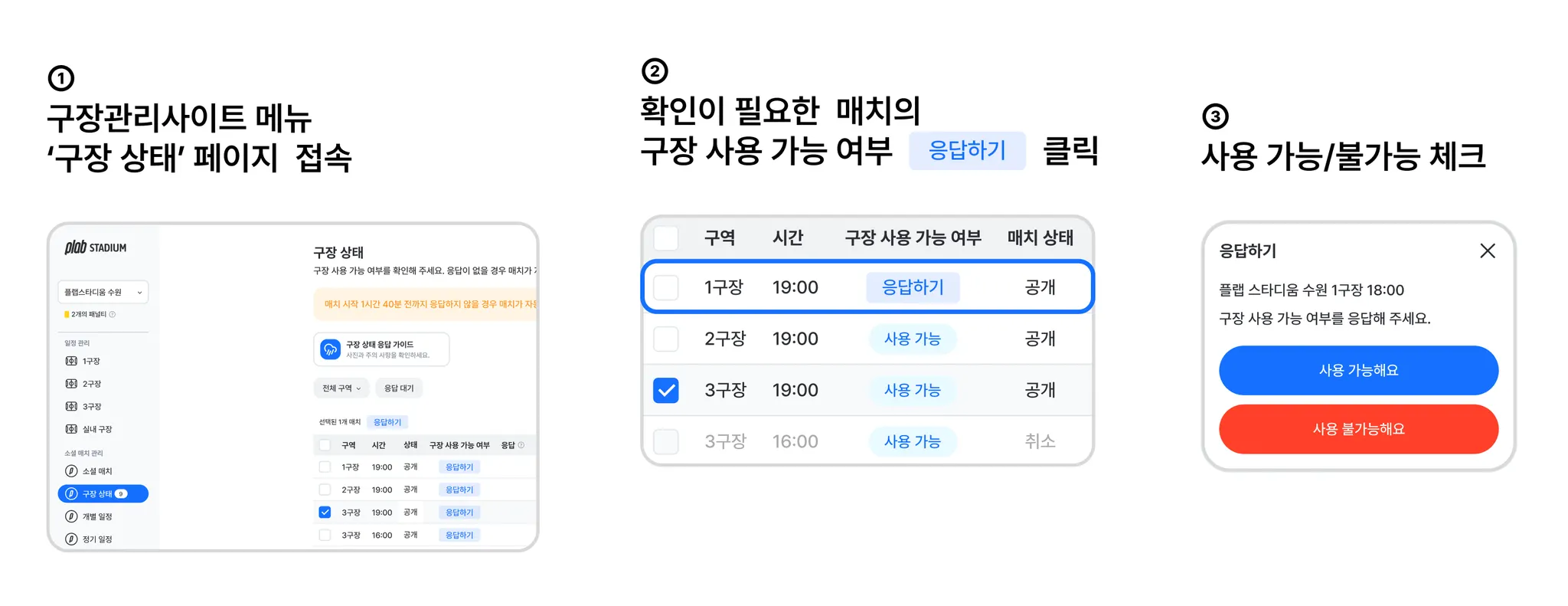 구장 관리 사이트에서 매치 진행 가능 여부를 알려 주세요.
