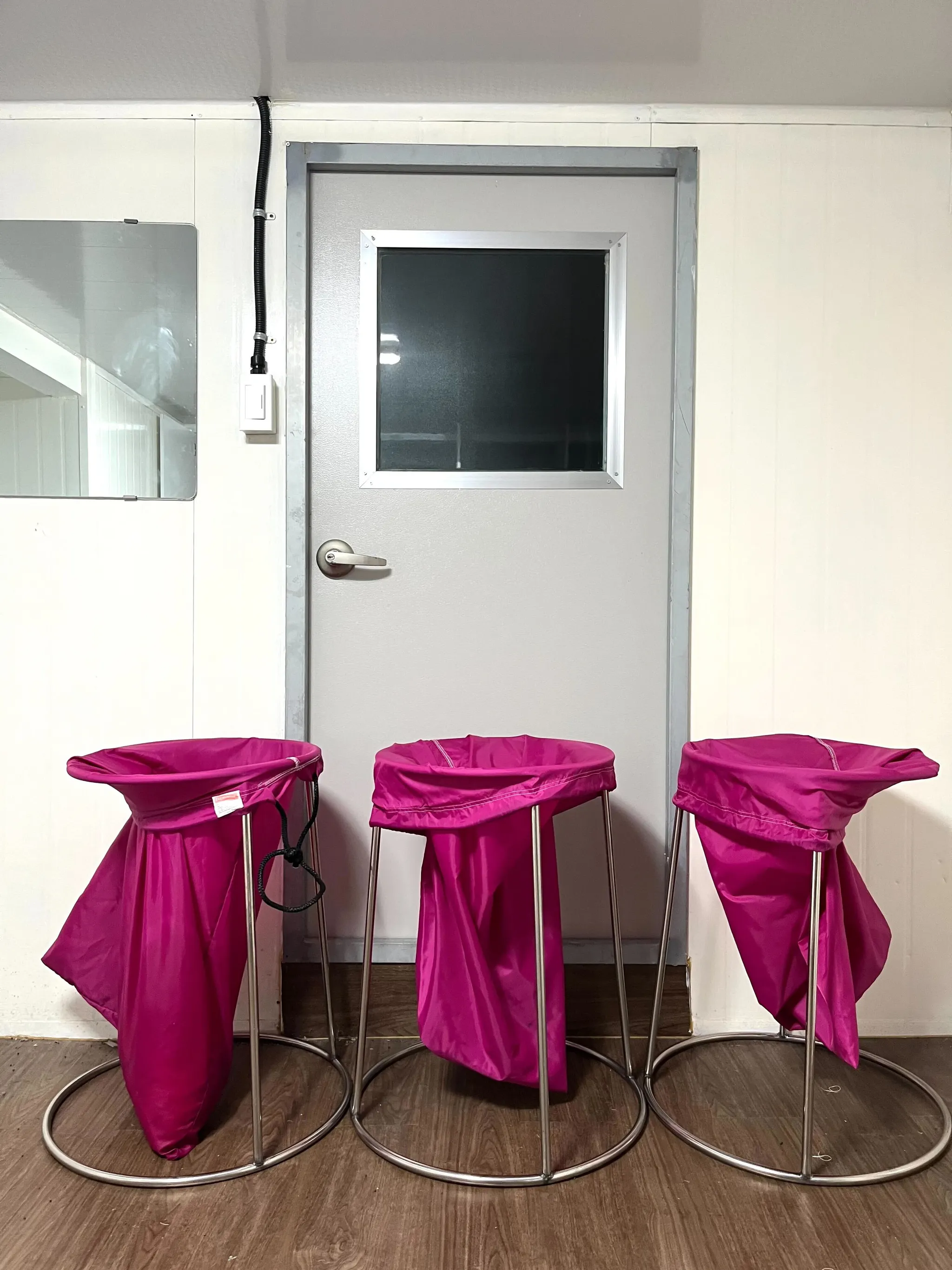 라커룸 맞은편에 분홍색 세탁 자루가 있어요