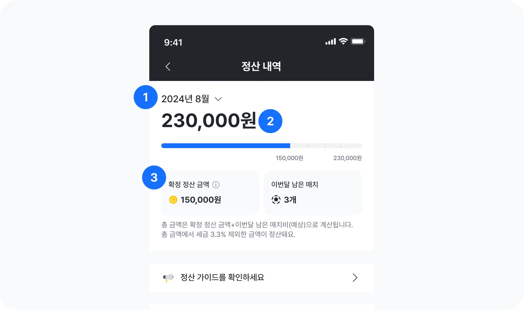 매치를 모두 마친 후 익월 2일 오전 9시에 정산금이 확정되며, 확정된 금액에서 사업소득세 3.3%가 제외된 금액이 입금돼요.