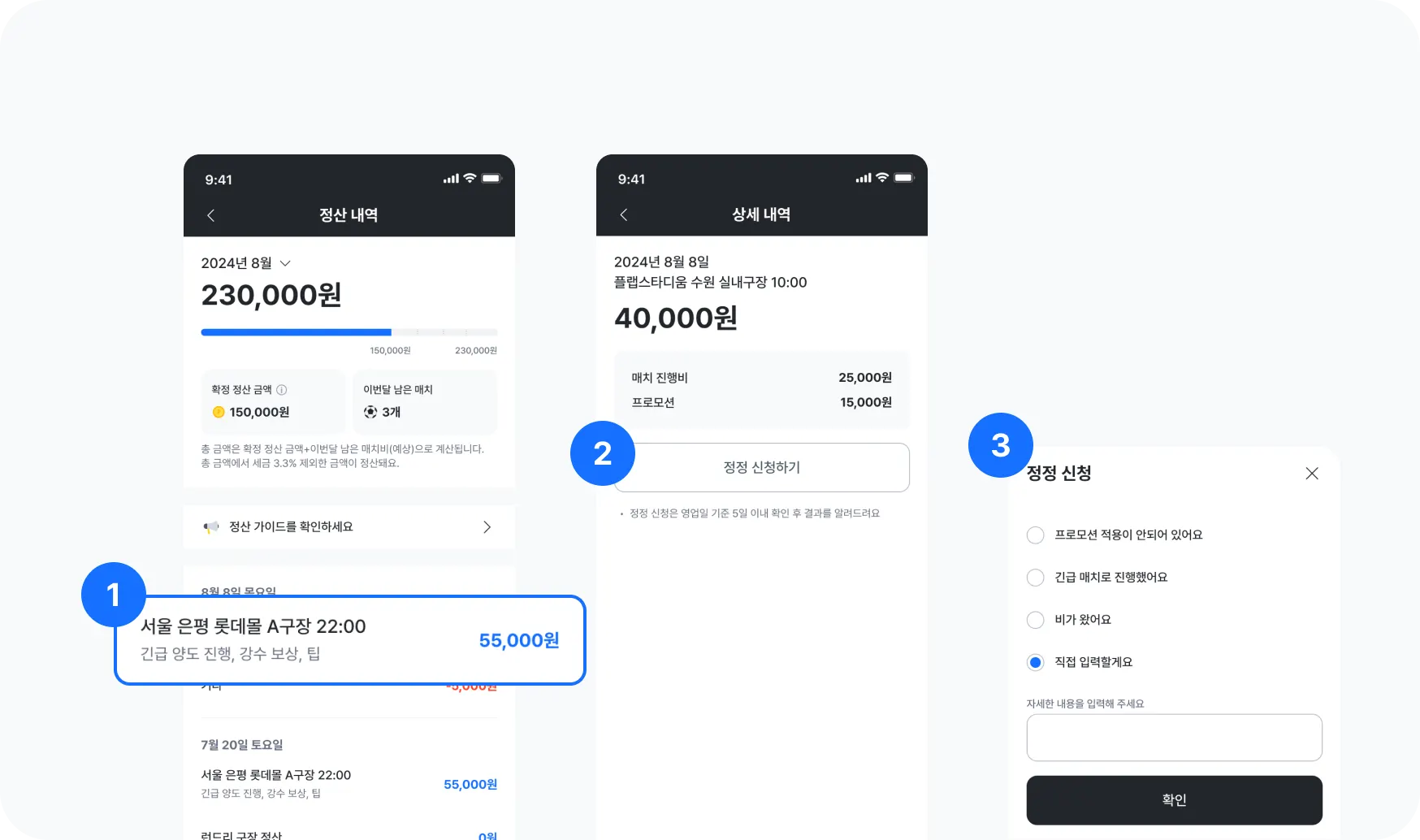 매치 정산서 상세 내역을 확인하고, 다른 내용이 있다면 정정 신청하기 버튼을 눌러주세요.