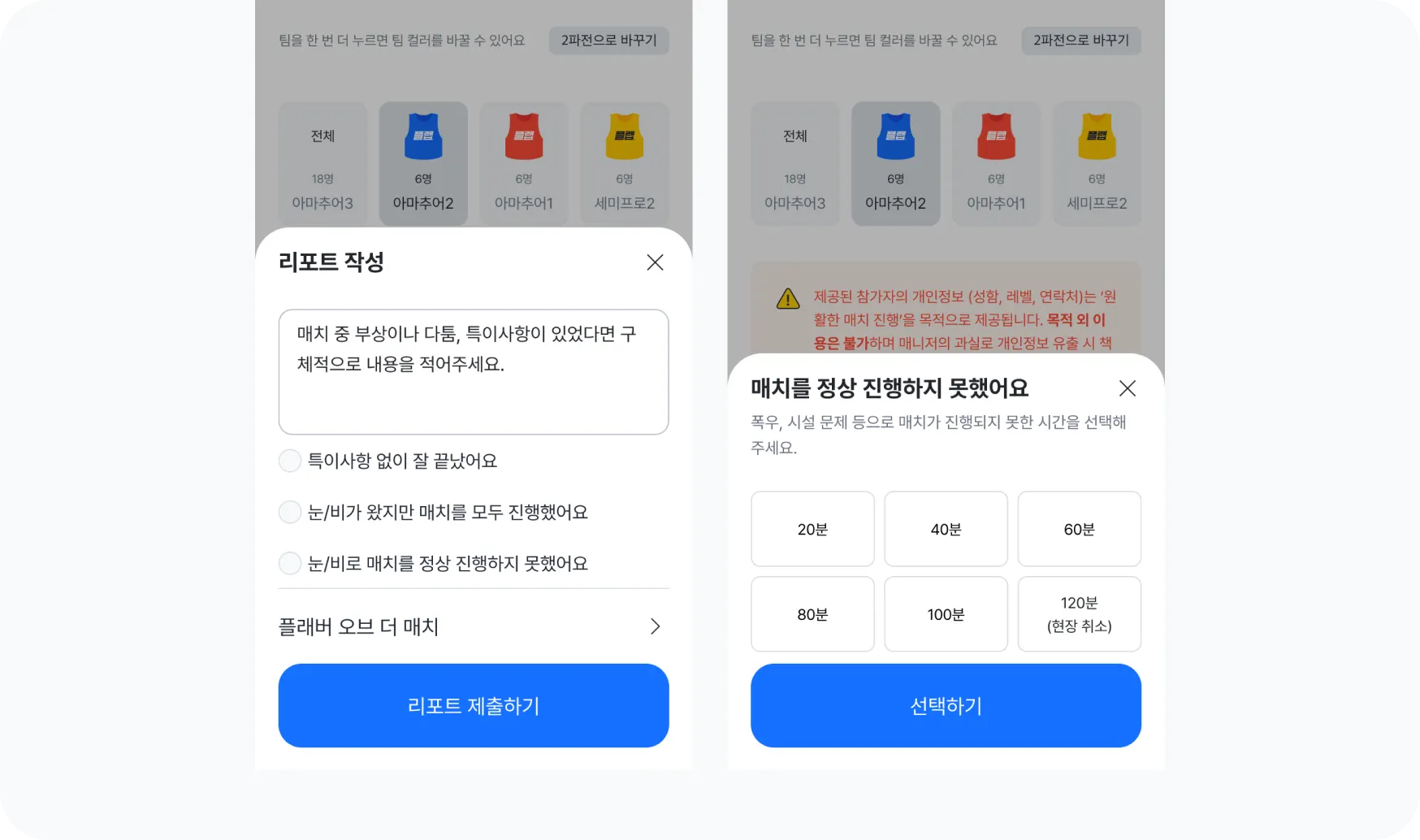 비(눈)가 와도 매치를 진행해요. 고생하는 매니저님들에게 추가 비용을 지급하니 매치 리포트에 진행 시간을 정확히 적어주세요.