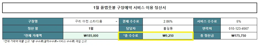 기존  | 구장 서비스 수수료 제외 총 정산금 매출 신고  |