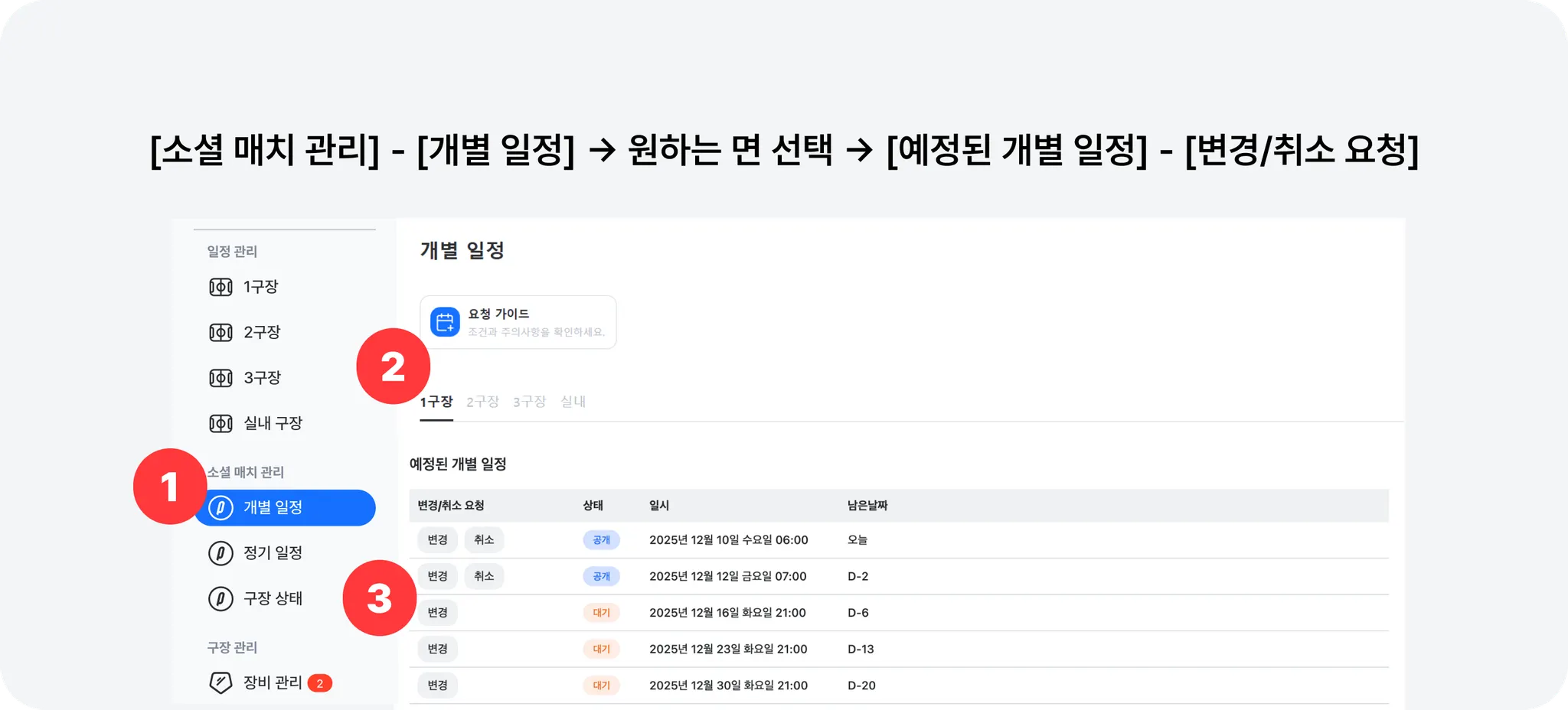 대기 매치는 [구장 관리 사이트] - [구장 일정 캘린더]에서 직접 취소해 주세요.