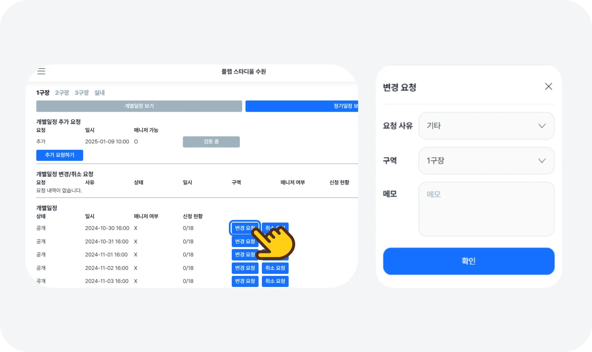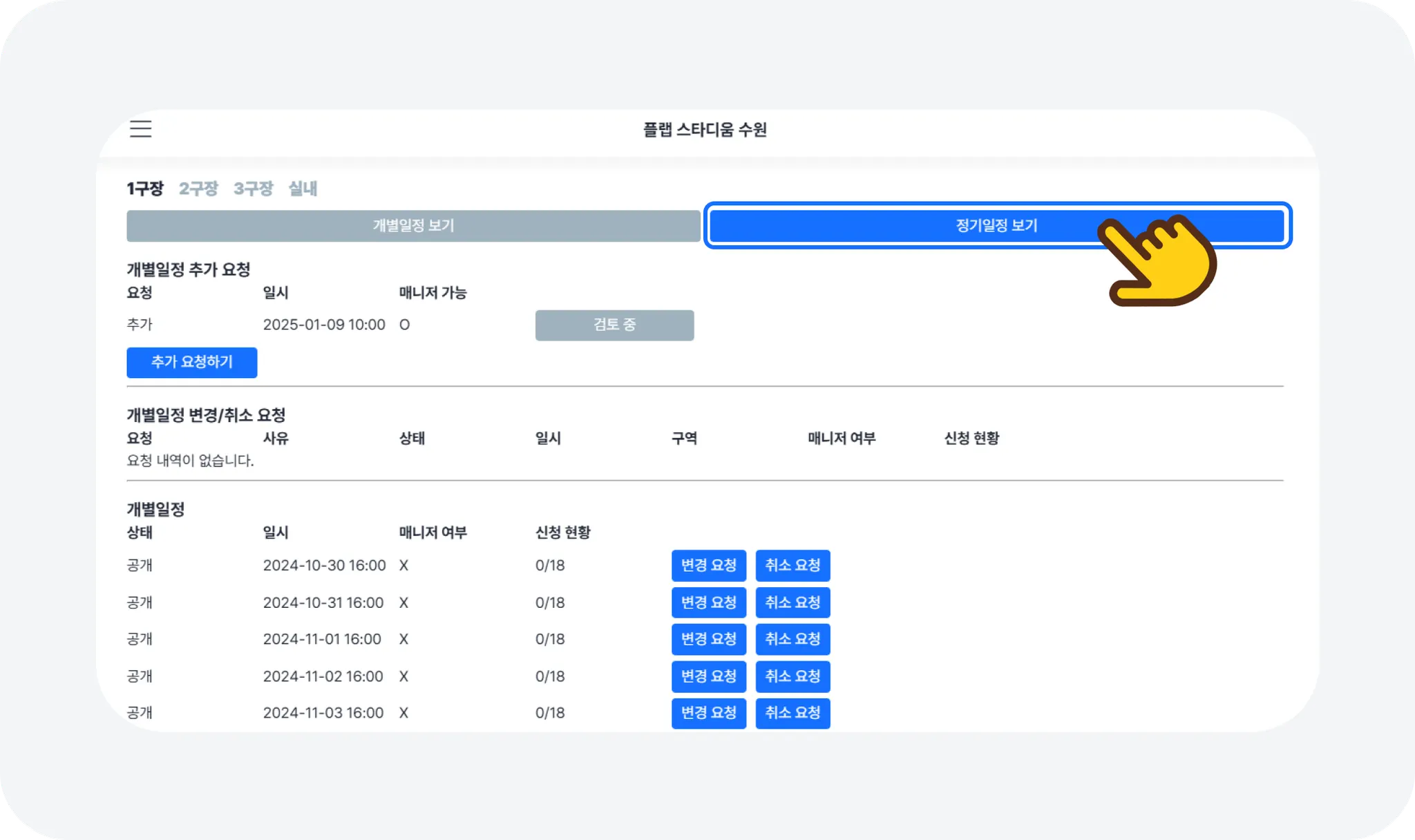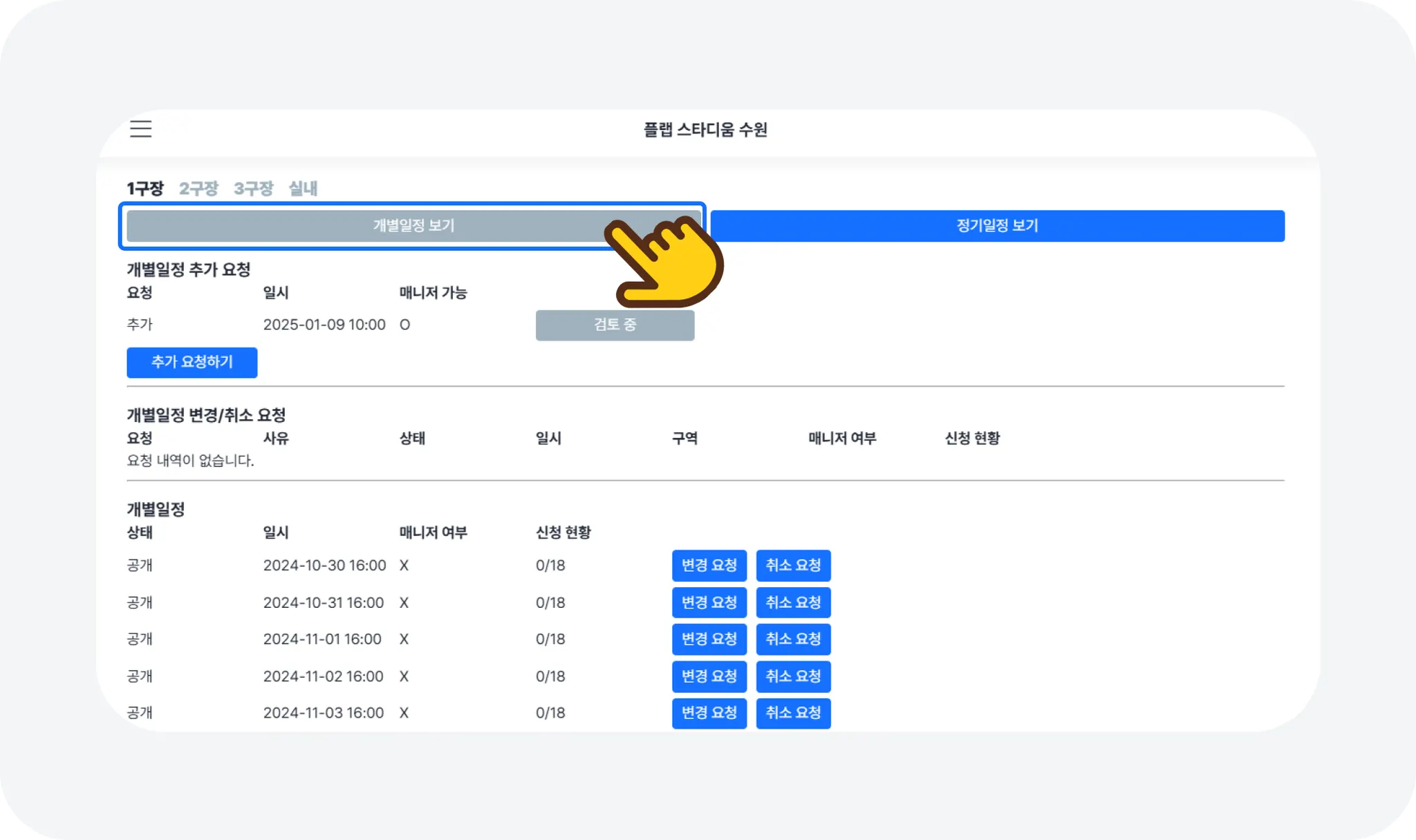 요청 방법: [개별 일정] 하단 리스트에서 해당하는 일정을 찾아 [변경 요청] 버튼을 누르고, 요청 사유 및 구역(면) 등 세부 내용을 입력해 주세요.