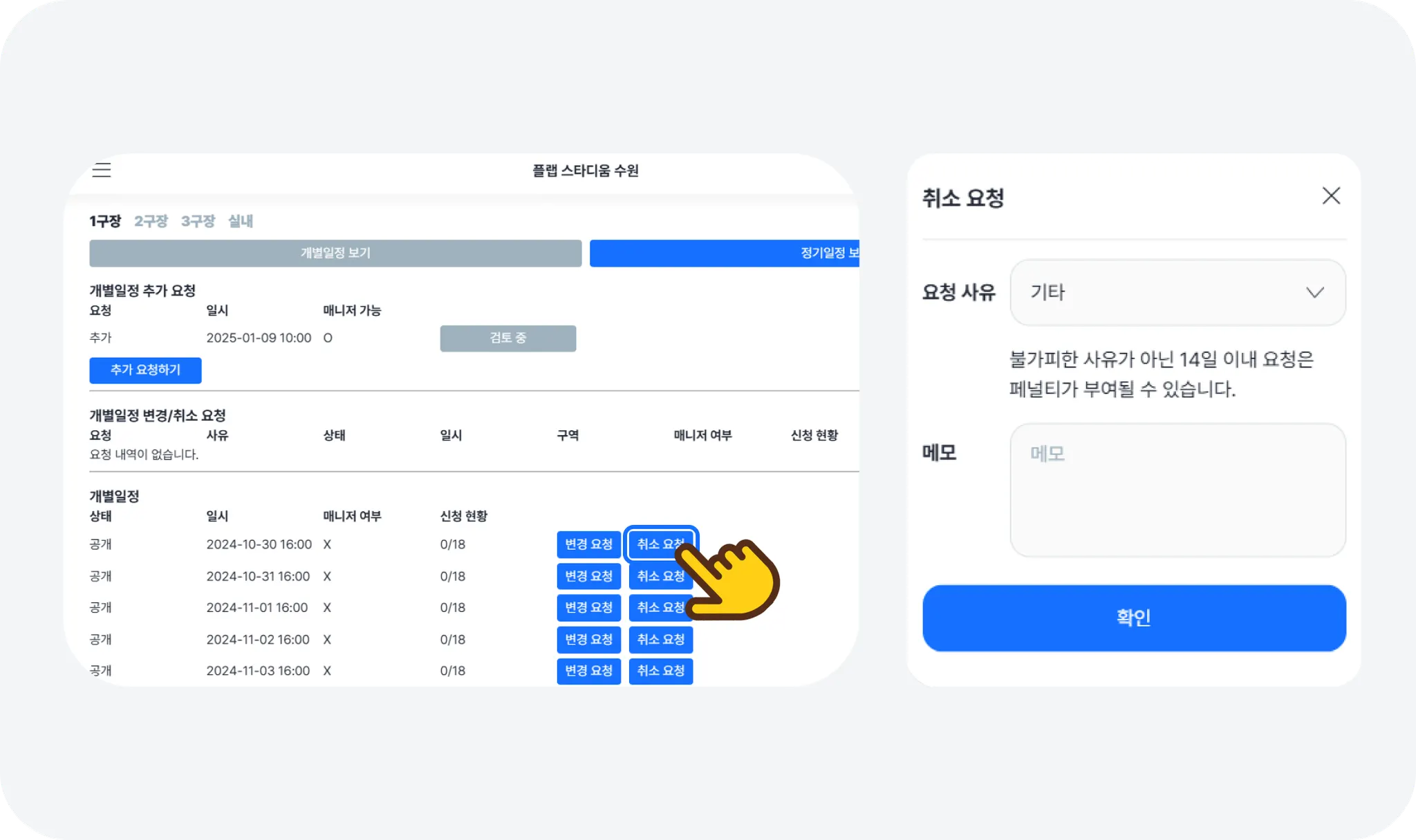요청 방법: [개별 일정] 하단 리스트에서 해당하는 일정을 찾아 [취소 요청] 버튼을 누르고, 요청 사유를 입력 후 [확인] 버튼을 눌러 제출해 주세요.