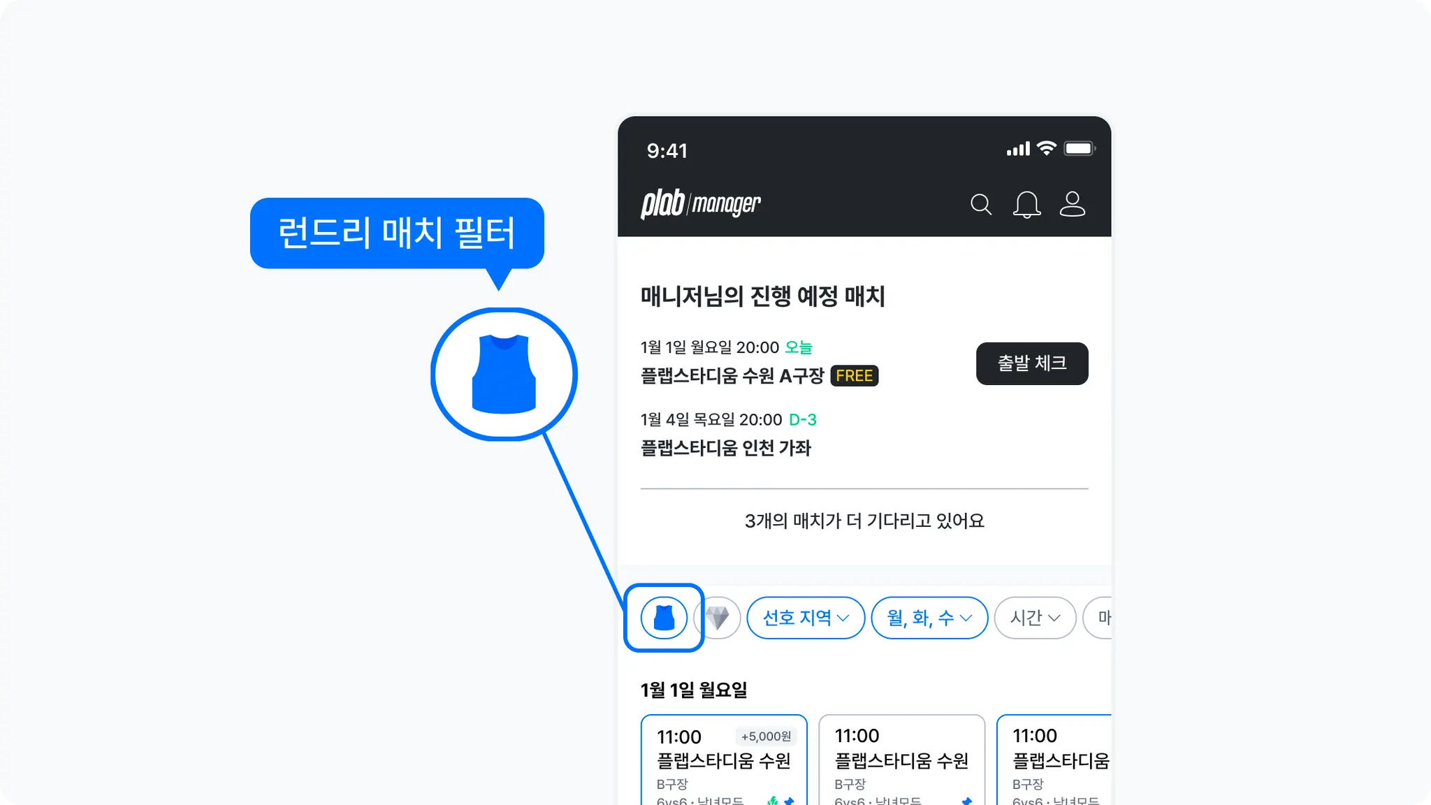 매치 선택 페이지에서 ‘런드리’ 필터를 통해 현재 런드리 서비스가 진행 중인 구장만 따로 확인도 가능해요.