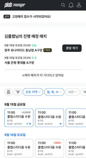 ( *필터종류 : 런드리구장, 프로모션, 지역, 요일, 시간, 매치타입, 성별 )