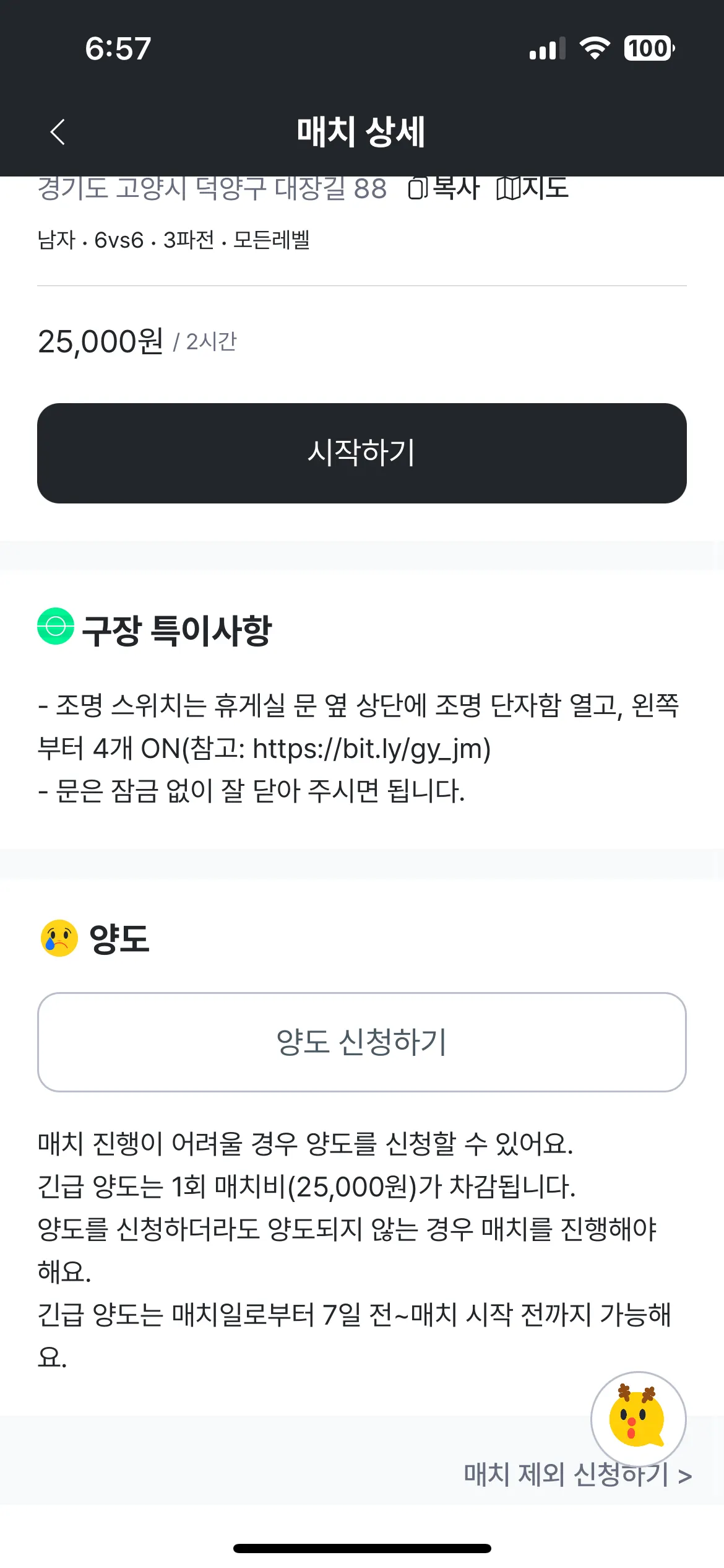 긴급 양도 완료된 매치가 취소되면 1회 매치비는 차감되지 않아요.