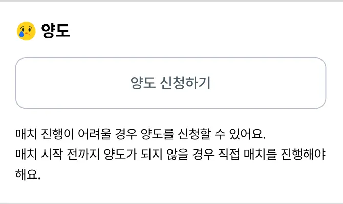 개인 사정으로 매치를 진행하기 어려운 경우 양도를 신청할 수 있어요. 마이페이지에서 나의 매치를 선택하세요. 나의 매치에서 원하는 매치를 선택 한 후 양도 신청하기를 선택하세요. 일반 양도 를 올린 후 긴급 양도 로 전환 할 수 있습니다.