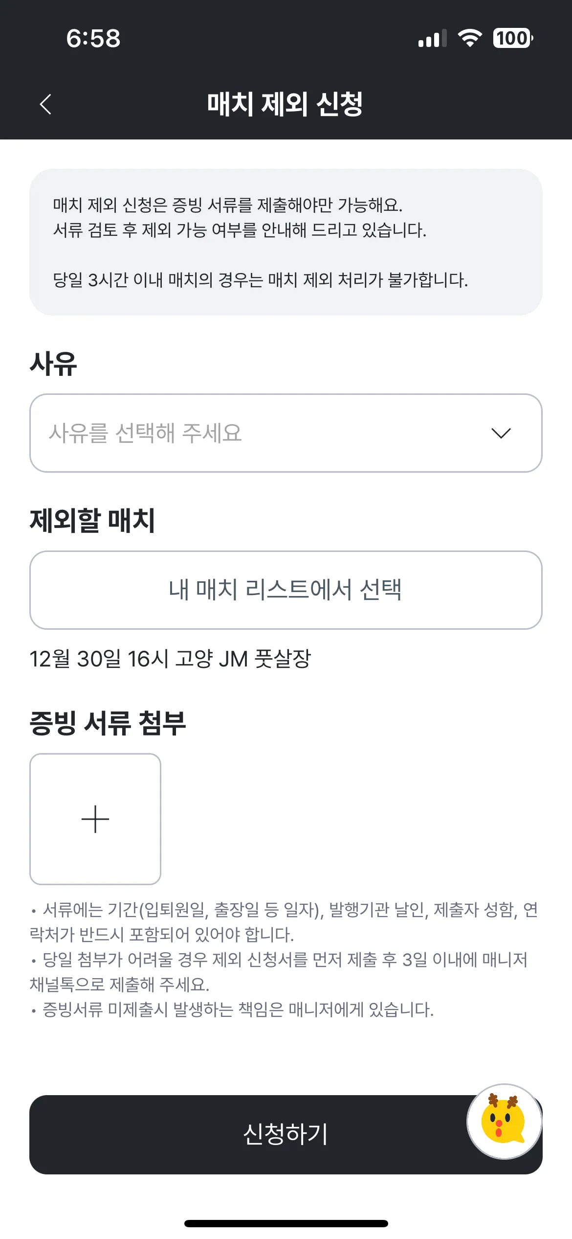 증빙서류가 필수로 첨부되어야 매치제외 신청이 가능해요.